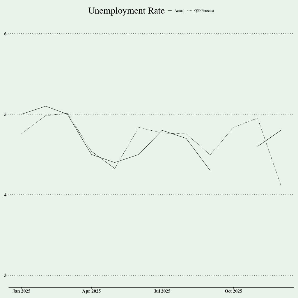It would have absolutely crushed in 2025, except at the end. You should always be skeptical of backtests, but the forecast below is from data up to December 2024. The gap in the series is because the BLS didn’t produce the data for October 2025 because of the budget “issue”.